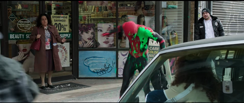 Sometime later, Parker went out of the apartment in his suit to catch a drug dealer. Rather than being thanked for his heroics, he got into an argument with some pedestrians regarding his age and a Mysterio supporter ambushed him by jumping out and splashing green paint across his suit in the process, much to Parker's annoyance and frustration.[6]